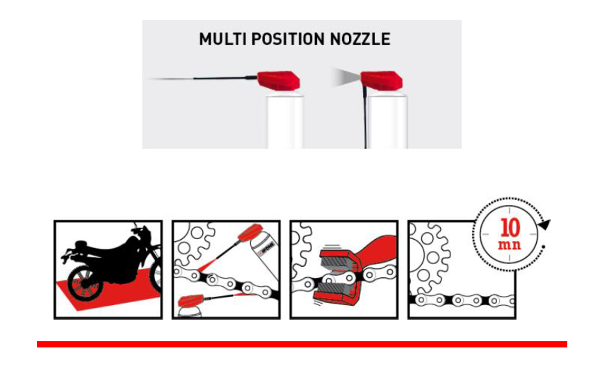 체인의 내부와 외부에 제품을 분무. 필요한 경우 박힌 그리스을 제거를 위해 브러시를 사용합니다.