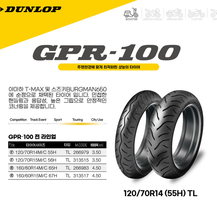 - 모델명: 던롭 타이어 120/70-14 GPR100F